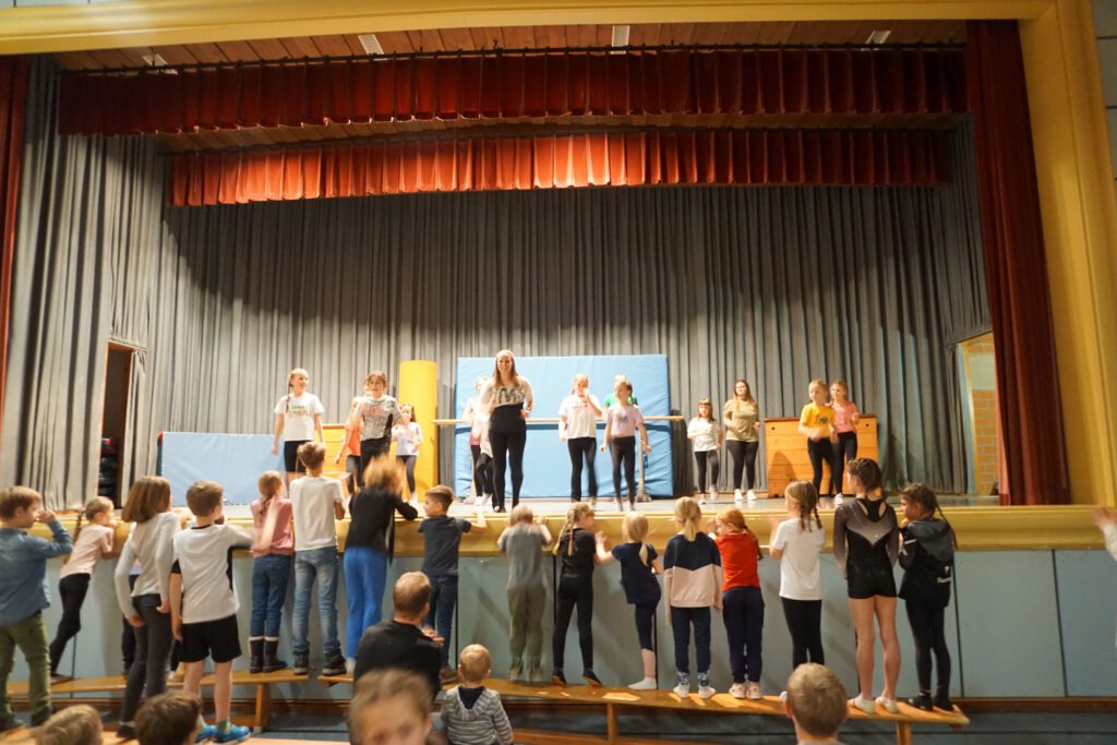 Turnerisch ging es weiter mit den Leistungsturnerinnen im Alter von 6 – 10 Jahren mit dem Titel „Girls in Motion“. Die 14 Mädchen hatten auch Kästen in verschiedenen Formationen aufgestellt und turnten darauf beeindruckende Sprünge und Rollen in großer Höhe. Zum Schluss bauten sie eine Pyramide. Es folgte die schwungvolle Vorstellung von Zumba-Teilnehmerinnen und den Zumba Kids zu mitreißender Musik.